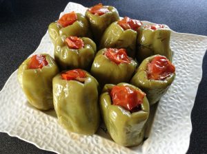Oyulmuş biberlere hazırlanan iç harçtan koyup domates ile kapatılır .