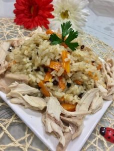 bol su ile yıkayıp süzdüğümüz pirinçleri ilave edelim birkaç tur çevirip baharatlarını ve üzümünü ekleyelim tavuk suyundan 3 bardak ilave edip kısık ateşte göz göz olana kadar pişirelim.